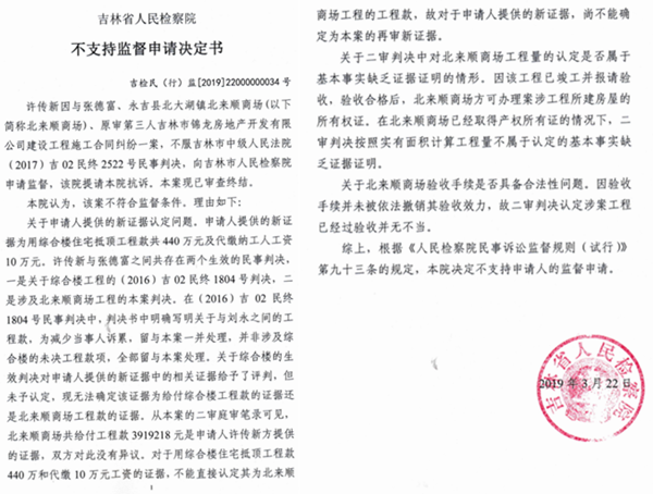 许传新仍然不服,于2018年和2019年,分别向吉林市检察院申请检察监督程序,吉林市检察院于2018年3月22日对许传新作出《不支持监督申请决定书》,2019年3月22日吉林省检察院对许传新的北来顺商场同样作出了《不支持监督申请决定书》。