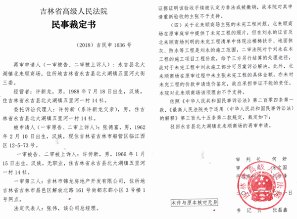 据相关法律文书记载,虽然以上判决均已生效,但许传新还是不服,于2017年、2018年分别将上述两案提请吉林省高级人民法院申请再审。吉林省高院分别于2017年11月20日和2018年8月21日作出民事裁定书,均驳回许传新和北来顺商场的再审申请。
