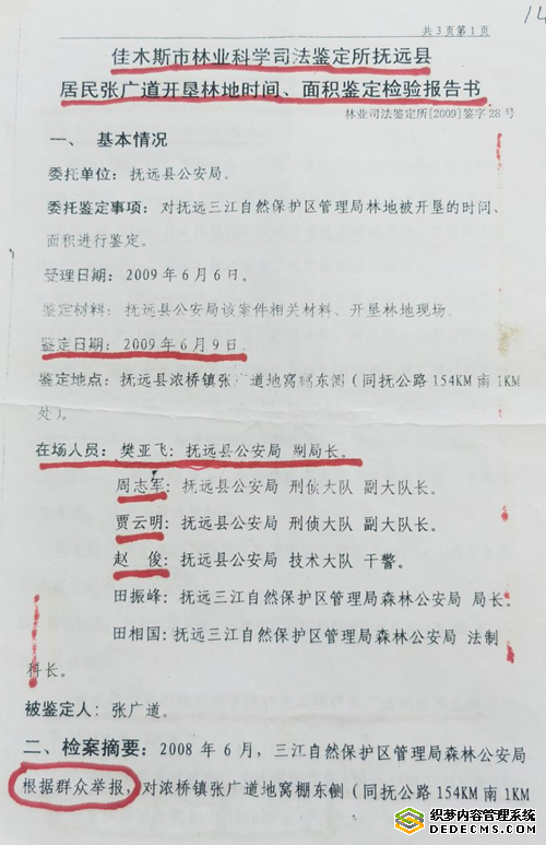 《佳木斯市林业科学司法鉴定所鉴定抚远县居民张广道开垦林地时间、面积鉴定检验报告书》