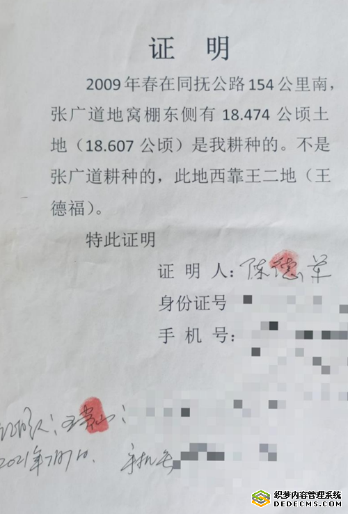 2021年7月7日,陈德军,王贵山亲笔为张广道写下证明:“2009年春在同抚公路154公里南,张广道地窝棚东侧有18.607公顷地(18.474公顷)是我耕种的,不是张广道耕种的,此地西靠王二地(王德福)特此证明”。陈德军、王贵山在证明书上签字,并留下身份证号码和联系电话。
