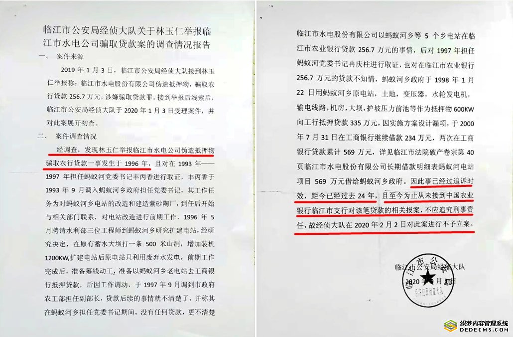 (二)林玉仁在持续多年的信访诉求过程中,获取到临江市公安局经侦大队对临江水电公司骗取贷款案的“情况报告”,证实:“临江市公安局于2020年1月3日立案调查,先后调取了原蚂蚁河乡党委书记冉庆祝、丰丙香证言,均证实临江水电公司用蚂蚁河乡电站抵押贷款情况不知情。由于过了追诉时效,亦未接到农业银行临江市支行的报案,不应追究刑事责任,故2020年2月2日对此案不予立案”。由此可见,枉法裁判导致金融诈骗犯罪分子至今逍遥法外。