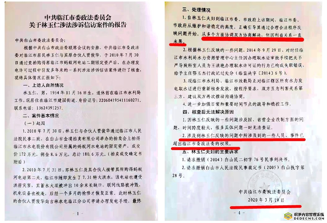 四是临江政法委,他们居然向上级行文称“林玉仁反映的问题,涉及的人员和事件己超出临江市政法委的权限”。