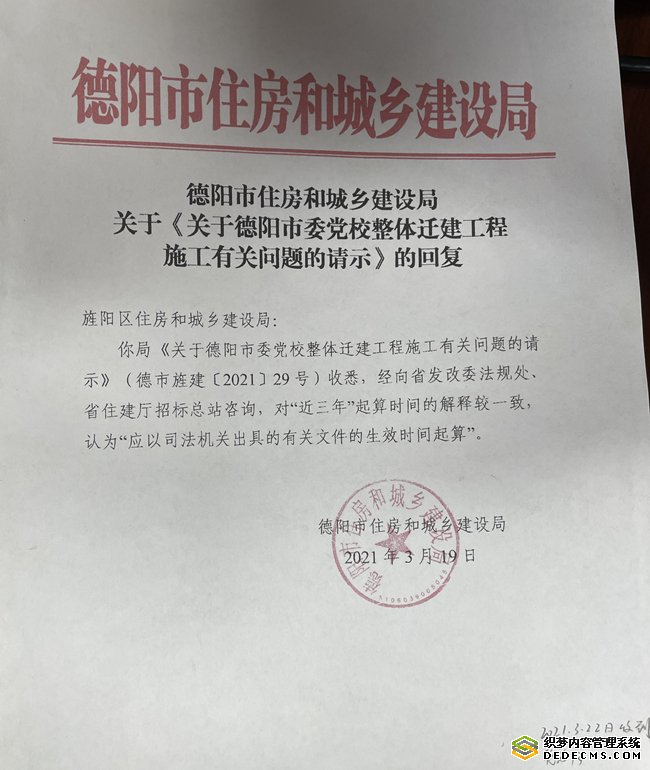 德阳市住建局称:对招标文件1.4.3(12)释法,向法定释法单位省发改委、省招标总站有请示。俩单位对媒体说没有收到德阳市住建书面请示,也没有书面答复。