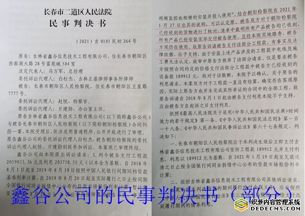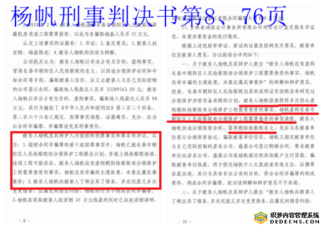 长春市二道区法院作出的(2021)吉0105民初264号民事判决书称:“结合朝阳检察院在2021年1月27日出具的说明,可以认定原、被告双方对于朝阳检察院已经收到的货物进行了核对,清单中载明所有产品被告均已收到,所有产品已经安装完毕交付被告使用,且经本院实地踏查、被告方现仍在使用。故原告诉请被告支付该部分工程款,有事实及法律依据,应子支持。”但仍称“本案系基于杨帆实施诈骗行为导致原告财产损失的事实而引发的纠纷”。也就是说,此案仅仅是杨帆个人实施的诈骗案子,与检察院无关!