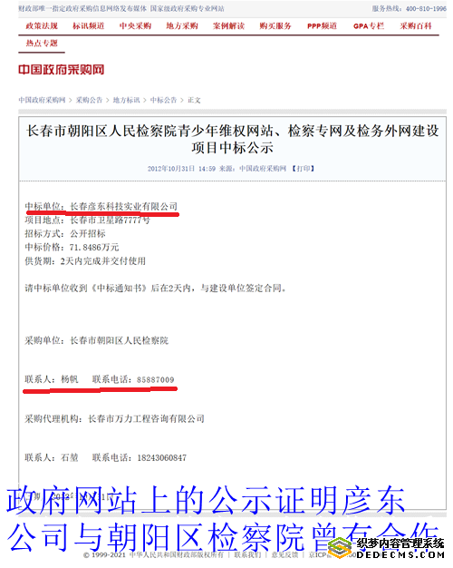 被害企业老板们说:合同上加盖了检察院公章和检察长的法人章后,他们还是不放心,又到政府网站上查询一番。在中国政府采购网上,他们查询到了“长春市朝阳区检察院计算机设备采购项目公开招标公告”。这份公告明确证明:朝阳区检察院的设备采购负责人就是杨帆!他们还查询到,长春盛鼎科技有限公司(简称盛鼎公司)和彦东公司就是该院设备采购招标的中标单位!