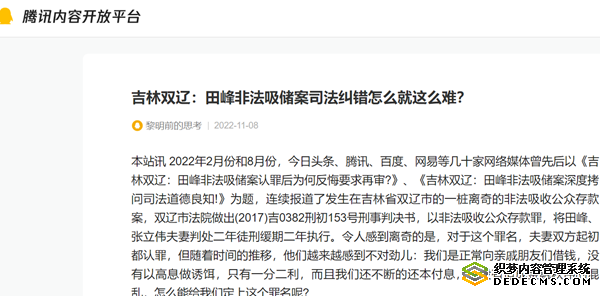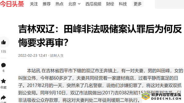本站讯 2022年2月份和8月份,今日头条、腾讯、百度、网易等几十家网络媒体曾先后以《吉林双辽:田峰非法吸储案认罪后为何反悔要求再审?》、《吉林双辽:田峰非法吸储案深度拷问司法道德良知!》为题,连续报道了发生在吉林省双辽市的一桩离奇的非法吸收公众存款案,双辽市法院做出(2017)吉0382刑初153号刑事判决书,以非法吸收公众存款罪,将田峰、张立伟夫妻判处二年徒刑缓期二年执行。令人感到离奇的是,对于这个罪名,夫妻双方起初都认罪,但随着时间的推移,他们越来越感到不对劲儿:我们是正常向亲戚朋友们借钱,没有以高息做诱饵,只有一分二利,而且我们还不断的还本付息,也没有造成金融秩序的混乱,怎么能给我们定上这个罪名呢?