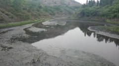 本站讯 近日,本网一行途经山西省灵石县两渡工业园区,发现河道内有墨黑的印迹,沿河道上行,两三公里处,本网发现了莫大的黑水池。