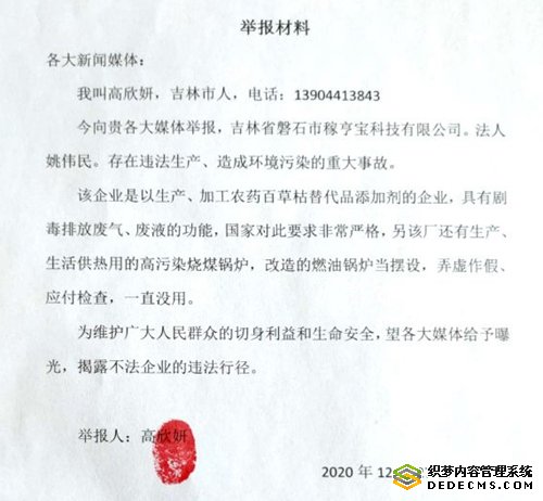 本站讯 近年来,在吉林省,磐石市曾经以软环境建设出名。由于诸多大企业以招商引资形式落户这里,其经济发展比较迅速。但是,就在磐石经济开发区,有一个叫做“磐石嫁亨宝科技有限公司”(简称嫁亨宝)的招商引资企业,近日爆出环境污染问题,先后有两人实名举报该公司环境污染严重。2020年12月28日,记者接到投诉后,立即前往调查采访。
