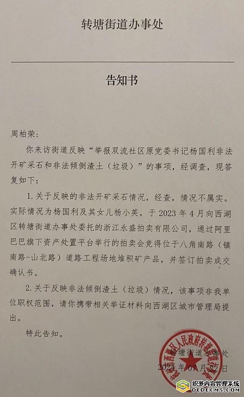 三是群众投诉问题解决不力。近年来,群众对建筑垃圾非法倾倒问题投诉不断,2023年1月至2024年4月,杭州市12345平台就接到此类问题投诉2700余件,一些问题重复投诉,始终未得到解决。督察发现,桐庐县分水镇武盛村被非法倾倒建筑垃圾9675立方米,侵占耕地3.2亩、林地1.7亩。富阳区新桐乡新店小高坞被非法倾倒渣土等共8675立方米,占地29.2亩,雨天大量渣土被冲刷进排洪沟,形成黄色泥浆水排入富春江。就拿周柏荣举报的杭州市西湖区转塘街道沈家坞路段(龙角路)偷倒建筑垃圾事件,他本人向双流社区领导反映过多次,但每次都如泥牛入海,有去无回。今年4月16日他又向转塘街道实名举报,结果直到7月22日在他反复要求下,才拿到一纸“告知书”。