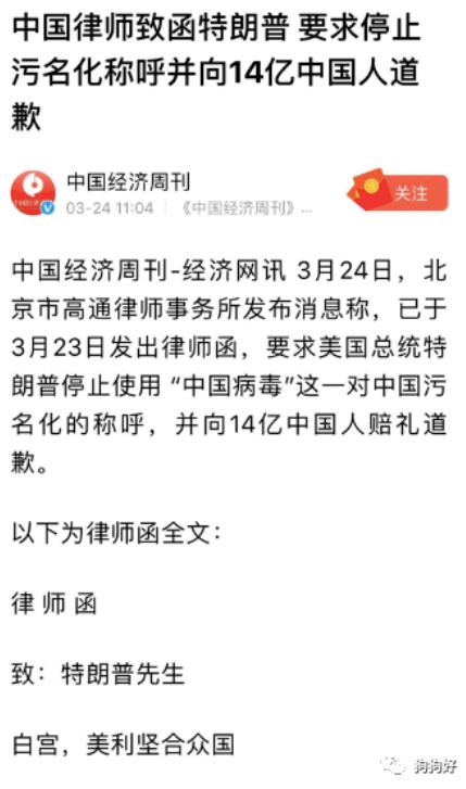 3月24日,北京市高通律师事务所发布消息称,已于3月23日发出律师函,要求米果总统特朗普停止使用 “中 国 病 毒”这一对中国污名化的称呼,并向14亿中国人赔礼道歉。