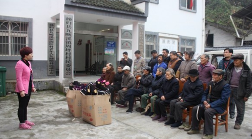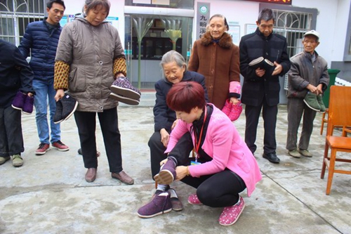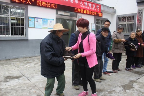 本站讯 (邹厚虎 李亚兵 秦士伟) 大爱无疆,善行天下。11月7日,中国公益在线秭归工作站在秭归县九畹溪镇周坪村隆重举行了爱心企业情系老年人捐赠活动,秭归三峡富鑫鞋业公司经理王家富给该镇周坪村和九畹溪村80岁以上的110名老人捐赠了精心制作的保暖棉鞋,在寒冬来临之际给耄耋老人们送去殷殷深情和拳拳爱心。在捐赠现场,三峡富鑫鞋业公司经理王家富亲自给到场的老人们换上制作精细、暖和舒适的手工保暖鞋,有几位老人的棉鞋有点不合脚,王家富又不厌其烦的给老人们反复试穿,就犹如亲孙女在给自己的爷爷奶奶穿棉鞋,那场面,那情景,特别温馨感人。