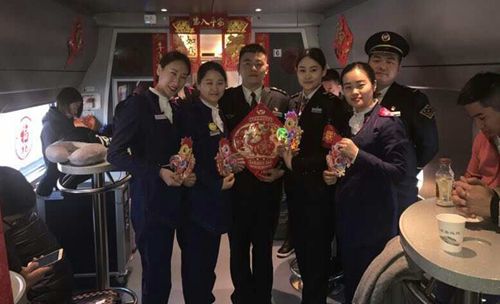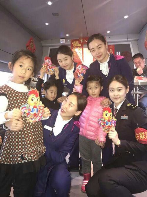 本站讯 2017年1月27日除夕。北京客运段京哈动车车队哈尔滨5.6组,在列车长仇兴楠、周晖的带领下,为乘车旅客送去新春的祝福。列车上精心布置的春联,吊钱,窗花,福字等使列车上年味十足。哈尔滨五组的列车工作人员为车上的小朋友送去了鸡年的吉祥物并与小朋友们合影留念,给大朋友和小朋友们分糖,增加了节日的喜庆和甜蜜;旅客们纷纷拿出手机扫一扫列车上的福字,希望得到五福带来好运。有的扫出了友善福,有的扫出了和谐福!有位幸运的旅客扫出了万能福,旅客高兴的说:今天晚上能分支付宝两亿红包了!感谢你们乘务员带给我的好运气!!!好多旅客要求正值大年三十,大家在车上相遇是缘分!咱们合影留念吧!大家开心的各自拿着福字照相留念!寄语:炮竹声声辞旧岁,欢度佳节福连天,宾朋满座笑开颜,举杯共饮幸福春,百幅福字传祝福,新春快乐合家欢,吉庆有余过大年!京哈动车车队哈尔滨5,6组全体员工祝列车上所有朋友们鸡年春节愉快!(记者张有彭)