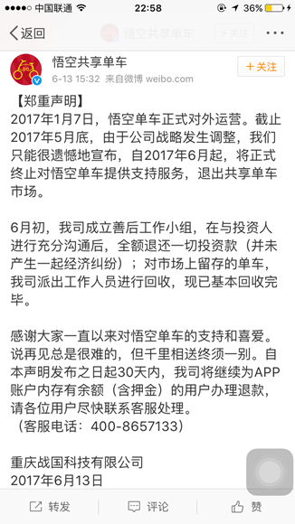 事情起源于一份声明,在正式运营仅仅5个月后,6月13日,悟空单车通过官方微博发布声明,正式退出共享单车市场。声明还指出,6月初,悟空方面已成立善后工作小组,在与投资人进行充分沟通后,全额退还一切投资款;对市场上留存的单车,已派出工作人员进行回收,目前已基本回收完毕。同时,将在声明发布之日起的30天内,继续为APP账户内存有余额(含押金)的用户办理退款。