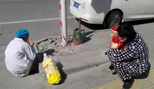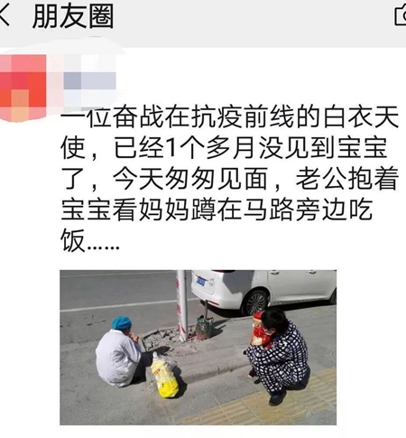 这天中午,她随车转送一个病人去县医院,返回途中已是中午。江世娥与老公通了电话。互道平安后,老公将孩子抱下楼,她便借此机会站在街道上远远地看上几眼,以解思念之情。婆婆听说儿媳回到县城,立马将做好的饭菜拿到楼下,说啥也要让她吃上几口。由于同事们在车上一边吃着泡面,一边等候着她,她也不再浪费时间,立马蹲在马路上狼吞虎咽地吃了起来。因为担心家人健康,江世娥不让抱着孩子的老公靠近。于是便有了身穿护士服的妈妈蹲路边吃饭,爸爸抱着不满一岁的孩子在一旁注视的这幅画面。照片中可以看到, 江世娥把身子侧在一边,没有面对家人。这顿饭,对她来说,吃出了人生的五味杂陈。