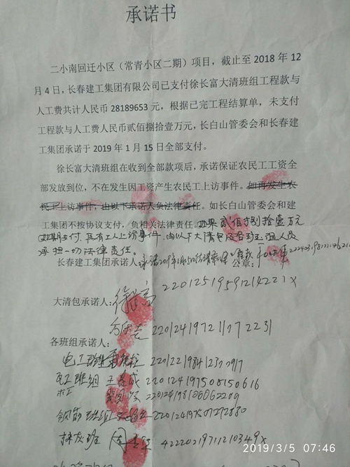 政府及相关单位的行为,充分体现了“全心全意为人民服务”的宗旨,政府的协调、感召和正能量,深刻地影响了长春建工集团及第六分公司的领导。他们积极配合,当场表态:即可进行双方对账,并写出还款《承诺书》之后,很快以现金形式、按实名制,直接发放到每个农民工手里面,将所欠的农民工工资全部支付。