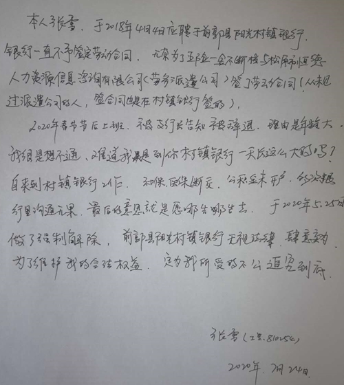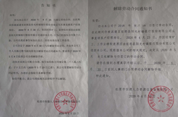 对于张雪的说法,人力资源和村镇银行一方有着不同的说法,松原市恒德人力资源信息咨询有限公司在给张雪的告知书中称: