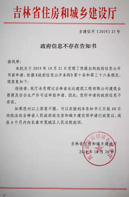 2019年10月份,徐凤琴向吉林省住房和城乡建设厅申请政府信息公开。10月30日,吉林省住建厅以红头文件的方式答复徐凤琴称:“经审查,我厅未受理过吉林省运达建筑工程有限公司建筑业资质及安全生产许可证审批申请。因此,您所申请的政府信息不存在。”