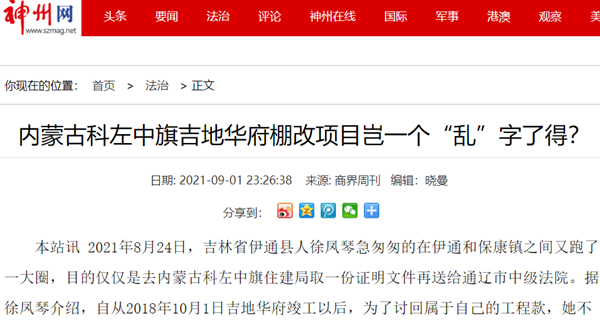 据多家媒体报道,2014年4月初,通辽市科左中旗保康镇棚户区改造项目对外发包,科左中旗国君房地产开发有限公司(以下简称国君公司)承接了该项目,项目名称为吉地华府小区,工程建筑总面积为87696.82平方米。