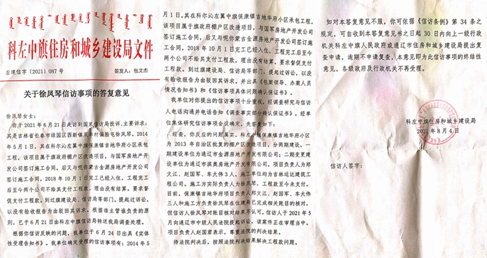 本站讯 2021年8月24日,吉林省伊通县人徐凤琴急匆匆的在伊通和保康镇之间又跑了一大圈,目的仅仅是去内蒙古科左中旗住建局取一份证明文件再送给通辽市中级法院。据徐凤琴介绍,自从2018年10月1日吉地华府竣工以后,为了讨回属于自己的工程款,她不知道在两个省区相隔260多公里的两个县级城市间跑了多少个来回了,可是至今没有任何结果。记者深入调查后发现,科左中旗的建筑市场简直乱到了一定程度,正是因为政府监管严重缺位,才导致了徐凤琴今天的悲剧。