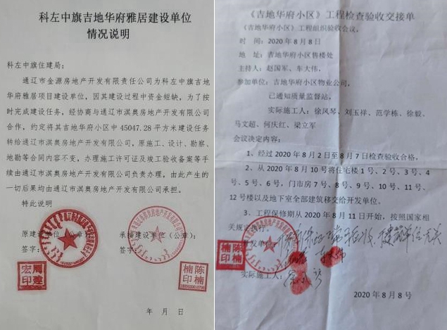 另据科左中旗住建局工作人员介绍,吉地华府项目开工时间为2014年5月。该项目虽然未经科左中旗发展和改革委员会立项,但该项目是内蒙古自治区住房和城乡建设厅备案的棚户区改造项目。该项目未履行招投标程序,确实存在建设单位未批先建及施工单位涉嫌资质造假,监管单位(住建局)违法、违规向不具备开工条件的建设项目核发规划许可证、施工许可证等违法、违规问题。在记者采访中,孙姓工作人员曾坦言,该项目的确是在未取得用地、规划及开工手续,且在未按规定履行招投标程序的情况下开工建设的,其向记者提供的相关备案、审批文件都是为了完善项目手续而后补办的。