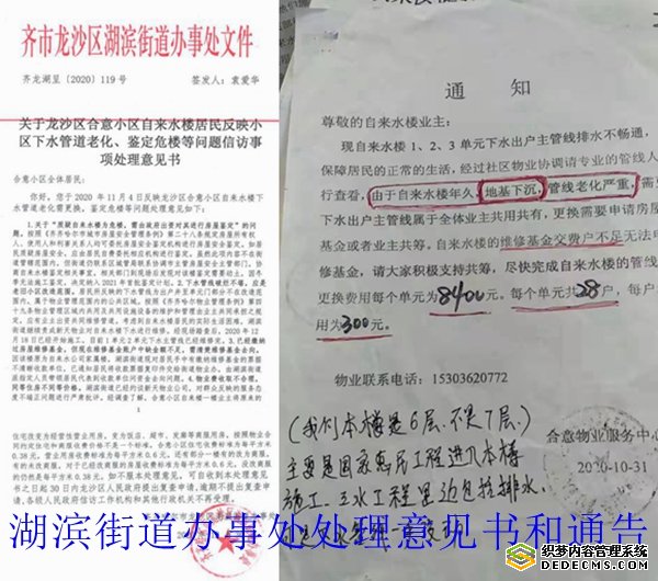 戚立艳在投诉信中介绍:合意小区自来水家属楼是1978年建造的,2020年6月份国家惠民工程进入前,龙沙区湖滨一厂社区已贴通知给水、排水、采暖等要进行三水改造,可后来不知为何下水管线一直未动。本楼居民一直向当地相关部门反映下水问题,国家惠民工程进入本楼施工期间,室内返下水,楼道、小区粪便污水横流,顺着楼房外墙根底部往外涌,却无人理会。万般无奈下从2020年11月4日起,戚立艳通过网络信访平台逐层反映问题。2020年12月16日,龙沙区区长许济淳牵头相关部门和居民代表开会协调此事,许区长在会上要求:物业服务水平、态度、能力、立行立改、小区物业服务项目要跟老百姓商量,他还再三强调相关部门工作人员负责确定问题很关键,要一次性把病根去掉。许区长让相关部门第二天定出方案到他办公室汇报,不考虑资金的事,要求工程速度提高等。可是,物业维修糊弄,室内、楼道严重破坏,之后室内厨房、卫生间仍旧频繁返水,在下水问题没有根本解决的情况下就扔下不管了。而早在2020年末,龙沙区湖滨街道办事处就往国家信访局回函称下水主管线已经维修完毕(详见齐龙湖呈【2020】119号袁爱华签发回函),一厂社区梁迪和闫艳代签并往国家信访局回函,随后一厂社区相关人员给我们居民打电话说不让传信访件了。