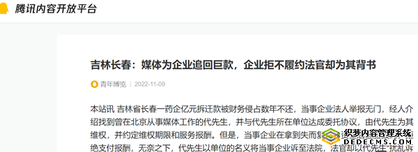 2019年11月,今日头条、搜狐、百度等多家网络平台转载了文章《吉林:亿元拆迁款被财务卷走……》,文章一经发出便在社会上引起广泛关注。