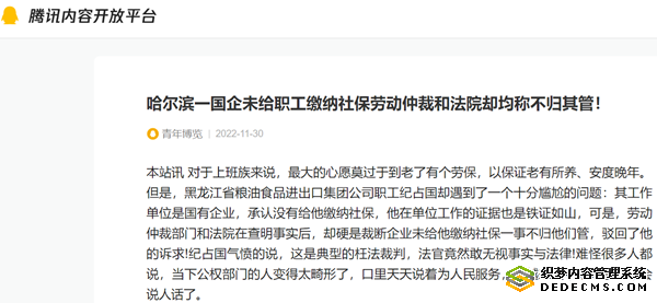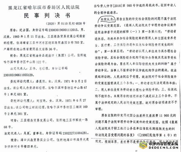 本站讯 对于上班族来说,最大的心愿莫过于到老了有个劳保,以保证老有所养、安度晚年。但是,黑龙江省粮油食品进出口集团公司职工纪占国却遇到了一个十分尴尬的问题:其工作单位是国有企业,承认没有给他缴纳社保,他在单位工作的证据也是铁证如山,可是,劳动仲裁部门和法院在查明事实后,却硬是裁断企业未给他缴纳社保一事不归他们管,驳回了他的诉求!纪占国气愤的说,这是典型的枉法裁判,法官竟然敢无视事实与法律!难怪很多人都说,当下公权部门的人变得太畸形了,口里天天说着为人民服务,却越来越不办人事、不会说人话了。