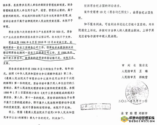 在到法院起诉之前,纪占国首先选择走劳动仲裁。但是,尽管省公司承认纪占国的问题属实,也认为应该给他补缴,哈尔滨市劳动人事争议仲裁委员会做出的哈劳人仲字(2018)第980号仲裁裁决书,却以此事不归其管为由驳回了他的全部仲裁请求。该裁决书称:本委认为:一,根据《中华人民共和国社会保险法》第五十八条、第八十六条之规定,申请人要求被申请人办理社会保险登记缴费,不属于劳动仲裁受案范围,本委不予审理。二、根据《中华人民共和国劳动争议调解仲裁法》第二条之规定,公积金及差旅费,不属于劳动仲裁受案范围,本委不予审理。三、根据《中华人民共和国劳动争议调解仲裁法》第六条、《中华人民共和国劳动法》第四十七条之规定,申请人虽于1992年调入被申请人单位,但劳动关系主体因其实际工作在三亚绿岛贸易发展公司,而三亚绿岛贸易发展公司是独立的法人单位,故申请人工资的支付义务应属于三亚绿岛贸易发展公司,申请人向被申请人主张工资属于主张不当,本委不予支持。