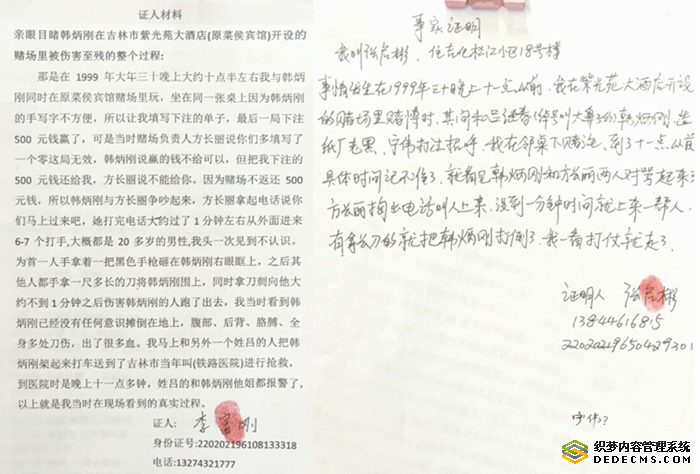 据当时在场目睹整个过程的李富刚介绍:1999年大年三十晚上大约10点多左右,我与韩炳刚同时在赌场里玩,坐在同一张桌子上,因为韩炳刚的手写字不方便,所以让我填写下注的单子,最后一局下注500元钱赢了,可当时赌场负责人方长丽说我们多填写了一个零,这局无效。韩炳刚说赢的钱不给可以,把下注的500块钱还给我。方长丽不给,说赌场不返还赌注。两个人随即争吵起来,方长丽拨通电话说:“你们马上过来吧!”大约1分钟左右,从外面进来6、7个打手,都是大概20多岁的男性,为首一人拿着一把黑色的手Q砸在韩炳刚的右眼眶上,之后,其他人都手拿一尺多长的刀将韩炳刚围上,用刀刺了大约不到1分钟之后都跑出去了,我当时看到韩炳刚瘫倒在地上没有任何意识。