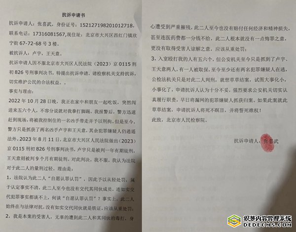 对于大兴区法院的这一判决,受害人张喜武不服,其认为大兴区法院的判决认定事实不清,对于两名嫌疑人的量刑过轻,经咨询律师后,于8月14日向北京市大兴区检察院提出抗诉申请书。其申请抗诉的理由有:
