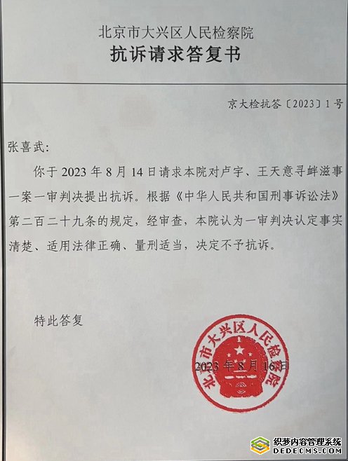 令人称奇的是,北京市大兴区检察院在收到张喜武的抗诉申请后,仅仅两天后,即8月16日就做出了不予抗诉的答复意见。北京市大兴区人民检察院抗诉请求答复书(京大检抗答【2023】1号)称:“经审查,本院认为一审判决认定事实清楚、适用法律正确、量刑适当,决定不予抗诉”。