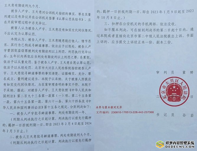 警察赶到后,将我自己抓住的那个人带到了西红门派出所,后来又将其送进了看守所。当时的监控拍的很清楚,包括行凶者开的车的车牌也都拍上了,还拍下了几个行凶人的影像。但是,在此案中,西红门派出所仅仅是抓到了一个人,就是被我控制住的那个人,这个人后来不知什么原因被取保了,后来才抓到了卢宇、王天意。参与入室打人的有五六个人,目前仅仅有两个人归案,有一个人被取保,起码还有两三个人仍然在逃,法院的判决书也认定作案的不仅仅只有卢宇、王天意两个人,是“被告人卢宇纠集被告人王天意等人”一起作案,“等人”就证明还有别人参与作案,而此案的幕后主使还没有抓到。对此基本事实,判决书中都没有说清楚,怎么能称其认定的事实清楚呢?岂不是滑天下之大稽吗?北京是祖国的心脏,是政治、文化中心,理应让人感到有安全感才对。堂堂北京城居然发生入室行凶的恶性事件,已经令人对北京感到失望了,但是大兴区公检法如此草草办案,就更加令人感到不安了。