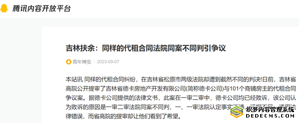 本站讯 同样的代租合同纠纷,在吉林省松原市两级法院却遭到截然不同的判决!日前,吉林省高院公开提审了吉林省德卡房地产开发有限公司(简称德卡公司)与101个商铺房主的代租合同争议案。据德卡公司提供的法律文书,此案在一审二审中,德卡公司均已经败诉,该公司认为败诉的原因是一审二审法院同案不同判,一、一审法院认定事实不清、证据不足、适用法律错误,而省高院的提审却让他们看到了希望。