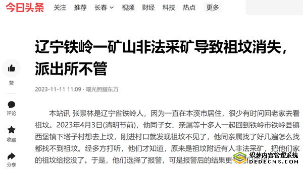 本站讯 张景林是辽宁省铁岭人,因为一直在本溪市居住,很少有时间回老家去看祖坟。2023年4月3日(清明节前),他同子女、亲属等十多人一起回到铁岭市铁岭县镇西堡镇下塔子村想去上坟,刚进村口就发现祖坟不见了,他同亲属找了好几遍怎么找都找不到祖坟。经多方打听,他们才知道,原来是祖坟附近有人非法采矿,把他们家的祖坟给挖没了。于是,他们选择了报警,可是报警后的结果更令他们失望!