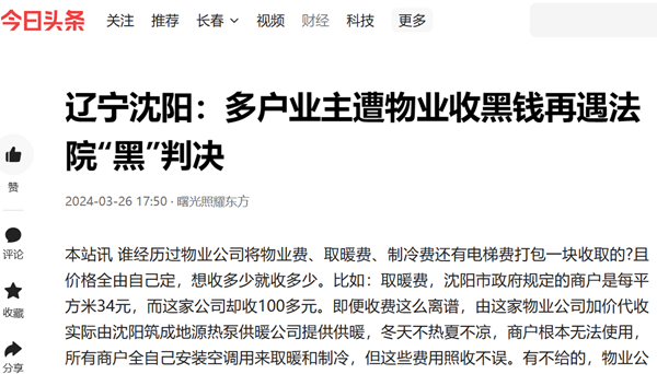 2023年10月,身为被告的刘女收到当地和平区法院的一审判决,法院竟然支持了这家物业公司的诉求,要求刘女士给付物业公司从2016年7月到2022年8月共58万余元的物业费.刘女士不服,上诉到沈阳市中级法院。庭审时,法官态度极其恶劣,居然袒护物业公司一方,根本不让念上诉状,说:“我问啥你答啥”。这样的庭审得出的结论也就可想而知了。3月6日,刘女士收到了市中院的判决书,判决的结果又支持了物业公司的的诉求,理由是:因为刘女士没亲眼看到招标人与投标人两家公司的利益输送,物业合同依然有效,综合物业费含供暖费、冷风费合理合法不予拆分,只是物业公司的服务实在是太差,象征性少收了4万元。刘女士向法官提出应该扣除停水、停电期间的综合物业费。法官则称:“说给你停水停电是你电费存款不够引起的停电,不是物业公司故意掐电造成的”。对此,刘女士十分不能理解,她说,不收电费和掐电造成的停电有什么区别吗?中院法官说这种话是法律知识不够还是另有其他的目的?法官还说:“给你下整改通知书、停水、停电的是前一个筑成物业不是现物业诚大新生活物业公司,所以我们没法扣除停水停电期间物业费”。刘女士问:“2016年7月招标完后,新物业公司已经进驻,情况发生在2017年7月3日,跟前物业有什么关系?既然一切服务都是原筑成物业公司干的,那新物业诚大新生活物业公司有什么资格来要物业费?”法官䃼充道:“这是两家物业公司同时在提供物业服务。刘女士又问:“根据《辽宁省物业管理条例》、《沈阳市物业管理条例》规定,物业费不能捆绑供暖费、电梯费。”法官说:“我们不受《辽宁省物业管理条例》、《沈阳市物业管理条例》约束。”经过一番争辩,法官大概也认为自己的判决有问题,将判决书收回。刘女士对这种既不愿花时间了解事实又不学习法理的法官,完全颠倒黑白的做法也是无语了。法官将本该重新判决或发回重审的案子,却下达了几乎维持原判的判决。刘女士问其理由,法官却说是业主太多,给刘女士改判怕其他业主全找上门来,这样他们法院会很麻烦。但是,在判决书送到刘女士手中之后又收回了,什么原因?刘女士不知,记者也不知。