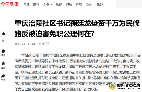 本站讯 日前,重庆市涪陵区珍溪镇中峰社区居民及原书记鞠廷龙向媒体投诉:受珍溪镇委托,镇领导要求中峰社区书记鞠廷龙垫资修建乡村道路,改变村容村貌,改善基础设施。鞠廷龙购买工程设备、雇请工程施工技术人员进行了施工。工程完工后,镇书记邱国光、镇长石以超、副书记蒋腾蛟却新官不理旧账,鞠廷龙讨要工程款民工工资时遭到拒付还被免职,还遭遇迫害关押!河北马树山案件在重庆涪陵珍溪镇重演。蓄意陷害垫资修建乡村道路改变村容村貌的社区书记鞠廷龙的人,则将全部工程作为自已的政绩而获得提拨!人们不禁要追问,公理何在?!