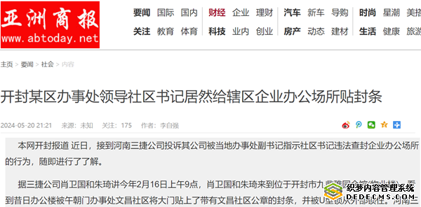 本网开封报道 近日,接到河南三捷公司投诉其公司被当地办事处副书记指示社区书记违法查封企业办公场所的行为,随即进行了了解。