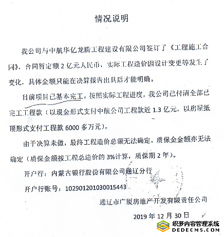 通辽广厦情况说明载明与中航华亿签订工程施工合同,且支付工程款