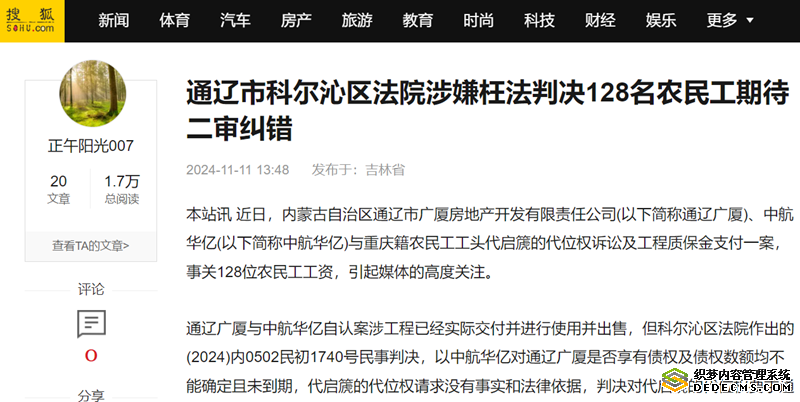本站讯 近日,内蒙古自治区通辽市广厦房地产开发有限责任公司(以下简称通辽广厦)、中航华亿(以下简称中航华亿)与重庆籍农民工工头代启篪的代位权诉讼及工程质保金支付一案,事关128位农民工工资,引起媒体的高度关注。