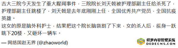 11月10日,网友“网络国赵无界”在网上爆料,吉林大学中日联谊医院发生重大凶杀案,院长刘天戟被护理部副主任给杀死了。护理部副主任跳楼了。刘天戟是去年底刚刚上任院长的。这女的原是脑外科护士,结果把这个院长脑袋割了下来,女的杀人后,纵身一跃眺下20楼,又砸坏一辆车。