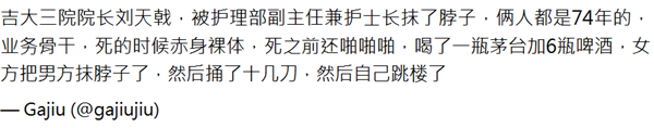 另一位网友“Gajiu”爆料更多案件细节:“吉大三院院长刘天戟,被护理部副主任兼护士长抹了脖子,俩人都是74年的,业务骨干,死的时候赤身裸体,死之前还啪啪啪,喝了一瓶茅台加6瓶啤酒,女方把男方抹脖子了,然后捅了十几刀,然后自己跳楼了。”