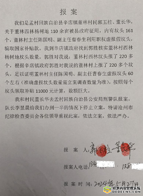 2024年5月25日,郭玉柱与村民董长华向县纪委监委、县公安局实名举报陈国明涉嫌诈骗。据郭玉柱描述,县公安局提供的村民领款表格显示,上报坟头数量为199座,其中包含多个“无名坟”,与实际情况严重不符。
