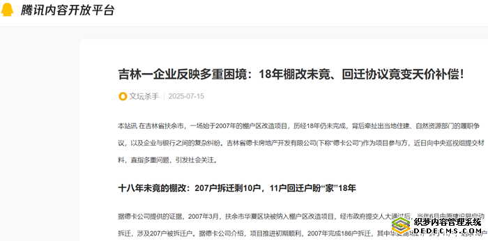 本站讯 在吉林省扶余市,一场始于2007年的棚户区改造项目,历经18年仍未完成,背后牵扯出当地住建、自然资源部门的履职争议,以及企业与银行之间的复杂纠纷。吉林省德卡房地产开发有限公司(下称“德卡公司”)作为项目参与方,近日向中央巡视组提交材料,直指多重问题,引发社会关注。