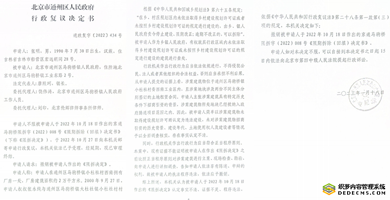 2022年10月18日,北京市通州区马驹桥镇政府作出的《限期拆除(回填)决定书》(京通马驹桥限拆字(2022)008号),及2022年10月24日作出的《强制拆除决定书》(京通马驹桥限拆字(2022)008号),这两份限期拆除决定书均被通州区人民政裁决违法、撤销。