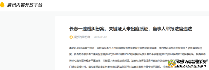 本站讯 2026年春节刚过,吉林省长春市人由自然就向吉林省高级法院提起再审申请,原因是在与孙可的被继承人债务清偿纠纷一案,由自然不服长春市南关区法院(2025)吉0102民初1567号民事判决及长春市中级法院(2026)吉01民终262号民事判决,其再审申请核心直指原审程序严重违法,关键证人未出庭接受质证、法官私自调取证言并直接作为定案依据等问题。同时,由自然已向相关部门提交举报材料,指控审理该案的长春市南关区法院邓翔匀法官在案件办理中滥用职权、枉法裁判,漠视当事人合法诉讼权利。