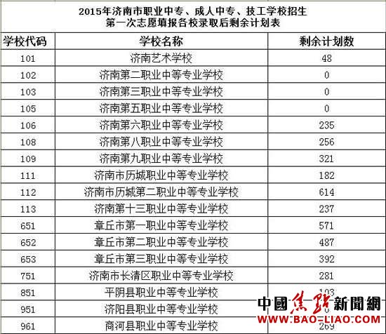 济南市中招办公布2015年济南市职业学校招生第一次志愿填报各校录取名单及剩余计划。内容包括济南市职业中专、成人中专、技工学校招生第一次志愿填报各校录取后剩余计划表。记者从济南市中招办了解到,今年考生及家长填报志愿更加理性,更多的考生选择职业院校就读,济南二职专等4所院校剩余计划数为0。