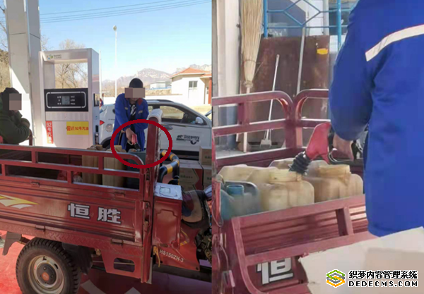 笔者在途经灵丘县上寨镇的一家名为中化石油的加油站时,看见一男子将一辆三轮车停在加油站内,加油站工作人员毫不犹豫的将标有92号汽油的油枪伸进车上塑料桶口进行加油。