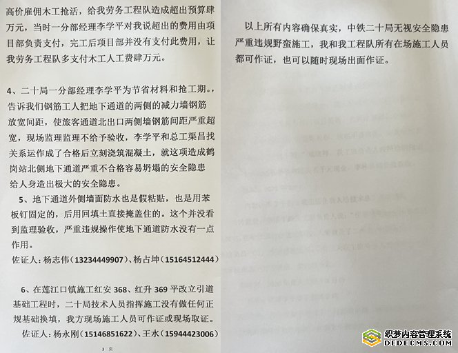 此外,杨永余还反映,项目存在偷工减料问题,并给知情者付了高额的封口费。2020年,中铁二十局佳鹤铁路改造项目部在施工新华-鹤岗高架桥墩柱多处未按照图纸配置钢筋,造成多处桥墩柱严重缺少钢筋,后来因为克扣劳务施工队工程款,施工队负责人手里掌握了材料,项目部最终全数付清了劳务款,并用高额现金支付给劳务施工队作为封口费。