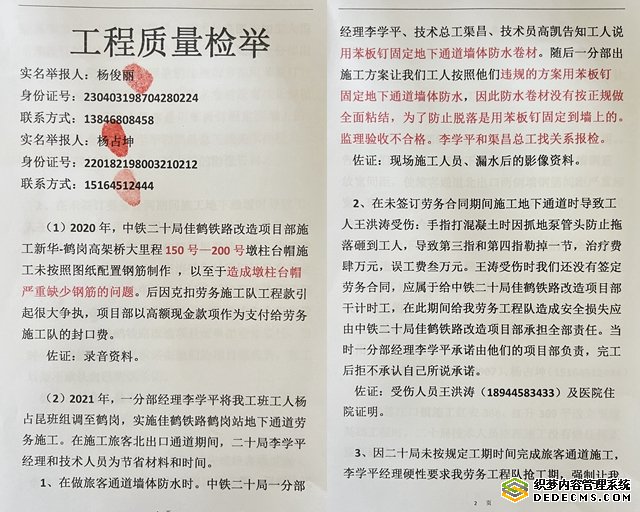 此外,杨永余等人还反映了李学平等项目工作人员克扣下属工班并索要好处费等诸多问题。记者了解到,此前,杨永余等人已将举报材料递交给中铁二十局集团及佳木斯市铁路指挥部。但目前还没有收到反馈信息。