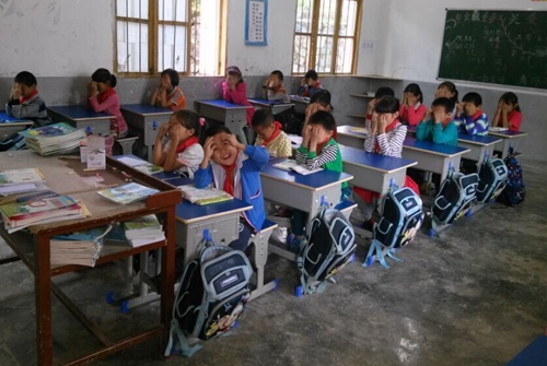 图为更换新桌凳教室里的一孩子做眼保健操时开怀一笑瞬间